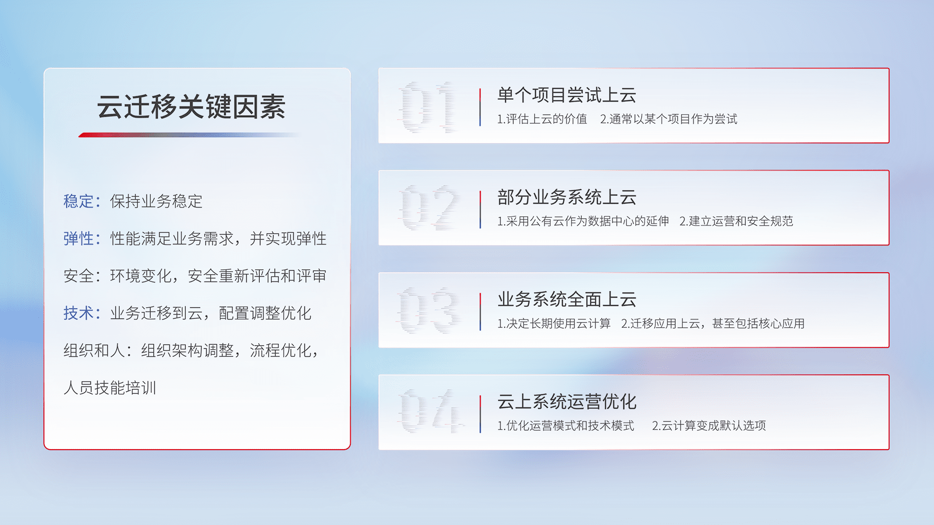 结合实际业务,,,从规划设计、、、、云平台选型、、、云原生改造、、数据迁移、、、集成交付,,迁移全过程为客户识别最佳上云路径,,,,做好风险识别管理,,,,设计网络架构、、身份权限、、安全审计合规、、、操作审计、、、日志审计、、、监控告警策略、、多站点容灾设计等,,对云上基础设施进行整体规划,,,提升IT治理水平,,,以满足弹性、、、、高可用、、、、高性能的需求。。